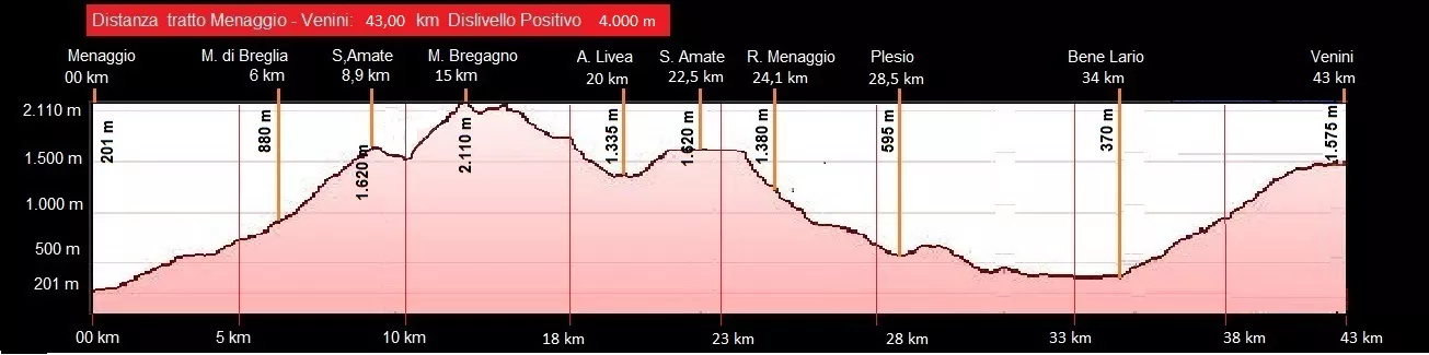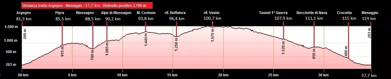 Najdłuższa trasa ma 119,1 km i przewyższenie rzędu 7500 metrów. Tworzy pętlę, start i meta ulokowane są w Menaggio. 82% trasy stanowi nawierzchnia terenowa, pozostałe to chodniki w miasteczkach oraz kostka brukowa. Na pokonanie trasy mamy maksymalnie 29,5 godziny, czyli od startu w sobotę o 8:00 do godziny 13:30 w niedzielę. Po drodze czekają cztery punkty kontrolne z nieprzekraczalnym limitem czasu: w Plesio (28,7 km – 7 h 35 min), San Fedele Intelvi (56 km – 14 h 45 min), Argegno (81,3 km – 19 h 20 min) oraz Venini (100,7 km – 21 h 20 min).