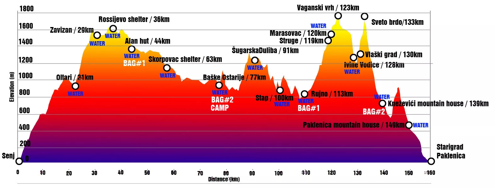 - Velebit 100 Milja: 160 km / 6500 m+. Start nad morzem w Senju, trasa przez oba najwyższe szczyty Velebitu, meta nad morzem w Starigradzie-Paklenicy, 12 bufetów w tym 1 z gorącym posiłkiem, 4 przepaki (2 worki dowożone w 2 miejsca każdy). Limit 50 godzin, 6 pkt. ITRA.