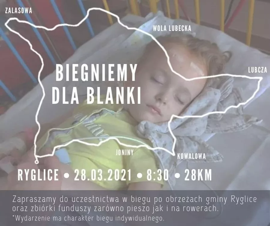 - Zapraszamy do uczestnictwa w biegu obrzeżami Gminy Ryglice oraz zbiórki funduszy na leczenie Blanki. Wydarzenie ma charakter indywidualnego biegu. Ze względu na sytuację epidemiologiczną nie możemy zrobić nic innego. Uczestnicy mogą pobiec, pojechać na rowerach z zawodnikami naszej Sekcji Biegowej. Zaproponowaną przez nas trasą lub inną, swoją ulubioną. Głównie chodzi o zbiórkę funduszy na leczenie chorej Blanki Lipowskiej oraz o uwrażliwienie ludzi, że mogą pomóc. Wyzwanie organizujemy wspólnie z wszystkimi biegaczami z naszej Sekcji Biegowej KS Ryglice – informuje Tobiasz Paluch z KS Ryglice, organizator imprezy.