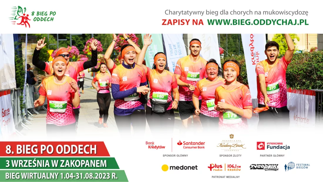 Już po raz ósmy 3 września o godzinie 10.00 biegacze z całej Polski staną na linii startu w Parku Miejskim w Zakopanem, by pomóc chorym na mukowiscydozę. Impreza gromadzi zarówno wyczynowych sportowców, jak i amatorów, a wśród nich osoby bezpośrednio dotknięte chorobą – chorych oraz ich rodziców, opiekunów, bliskich czy lekarzy i rehabilitantów. Patronat honorowy nad 8. Biegiem po Oddech objęli: Państwowy Fundusz Rehabilitacji Osób Niepełnosprawnych, Starosta Tatrzański, Burmistrz Miasta Zakopane oraz Justyna Kowalczyk-Tekieli i Kacper Tekieli, którzy zapowiedzieli swoją obecność.