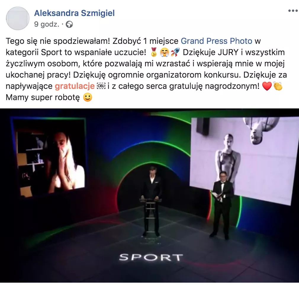 To nie koniec biegowych wątków w wynikach Grand Press Photo 2020. Laureatką nagrody w kategorii „Sport” została Aleksandra Szmigiel (Agencja Reporter), której prace dobrze znają m.in. kibice lekkiej atletyki oraz biegów ulicznych w stolicy. Nagrodzona fotografia przedstawia irlandzką pływaczkę Clare Cryan obserwującą skok do wody reprezentacyjnej koleżanki.