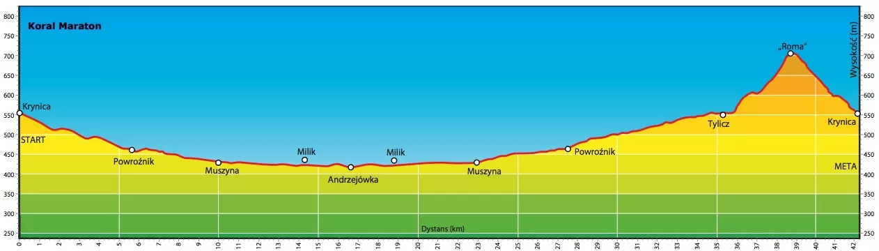 Trasa festiwalowego maratonu w całości drogami asfaltowymi (nieliczne odcinki po równej kostce), niemniej to jeden z tych biegów, które wymagają solidnej bazy treningowej. Trzeba przebiec nie tylko 42 km 195 metrów, ale też pokonać na tym trudnym dystansie spore przewyższenie. O ile pierwsza część dystansu, przebiegająca m.in. trasą Życiowej Dziesiątki, jest przyjazna dla biegaczy, to od 22-23 km, od Muszyny, zaczyna się długi, kilkunastokilometrowy podbieg przez Powroźnik i Tylicz zwieńczony prawdziwą wspinaczką na „Romę”. Dopiero 4 finałowe kilometry to już zbieg do Krynicy, w kierunku mety.