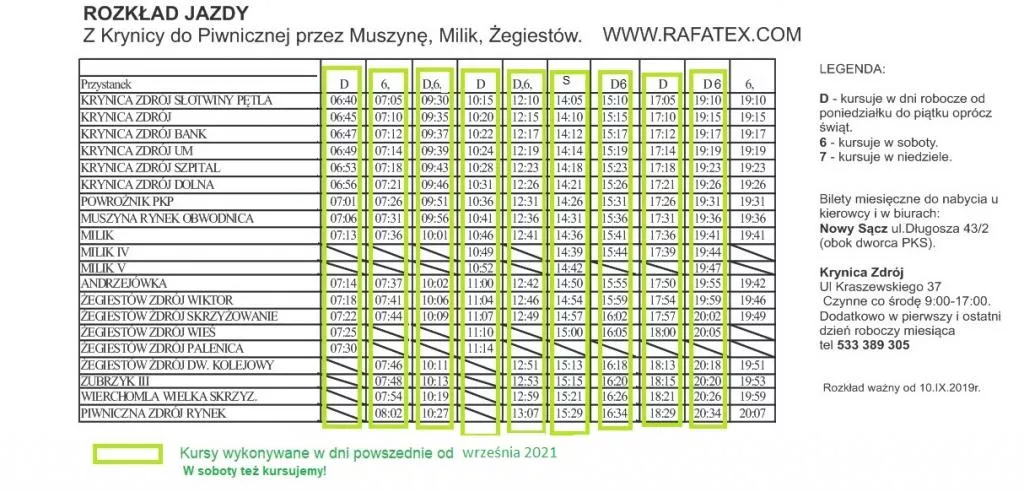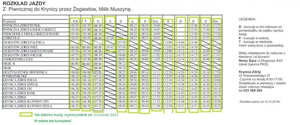 Przejdźmy do transportu autobusowego. Najwięcej połączeń na trasie Nowy Sącz – Stary Sącz – Rytro – Piwniczna-Zdrój oferuje dzisiaj MARPOL. W tym wypadku pełny rozkład jazdy (uwaga na zmiany po wakacjach) znajdziecie w galerii zdjęć dołączonej do tej publikacji. Zawiera on również połączenia wewnątrz gminy, czyli między Piwniczną-Zdrój a miejscowościami Łomnica, Zubrzyk, Wierchomla i Kokuszka.