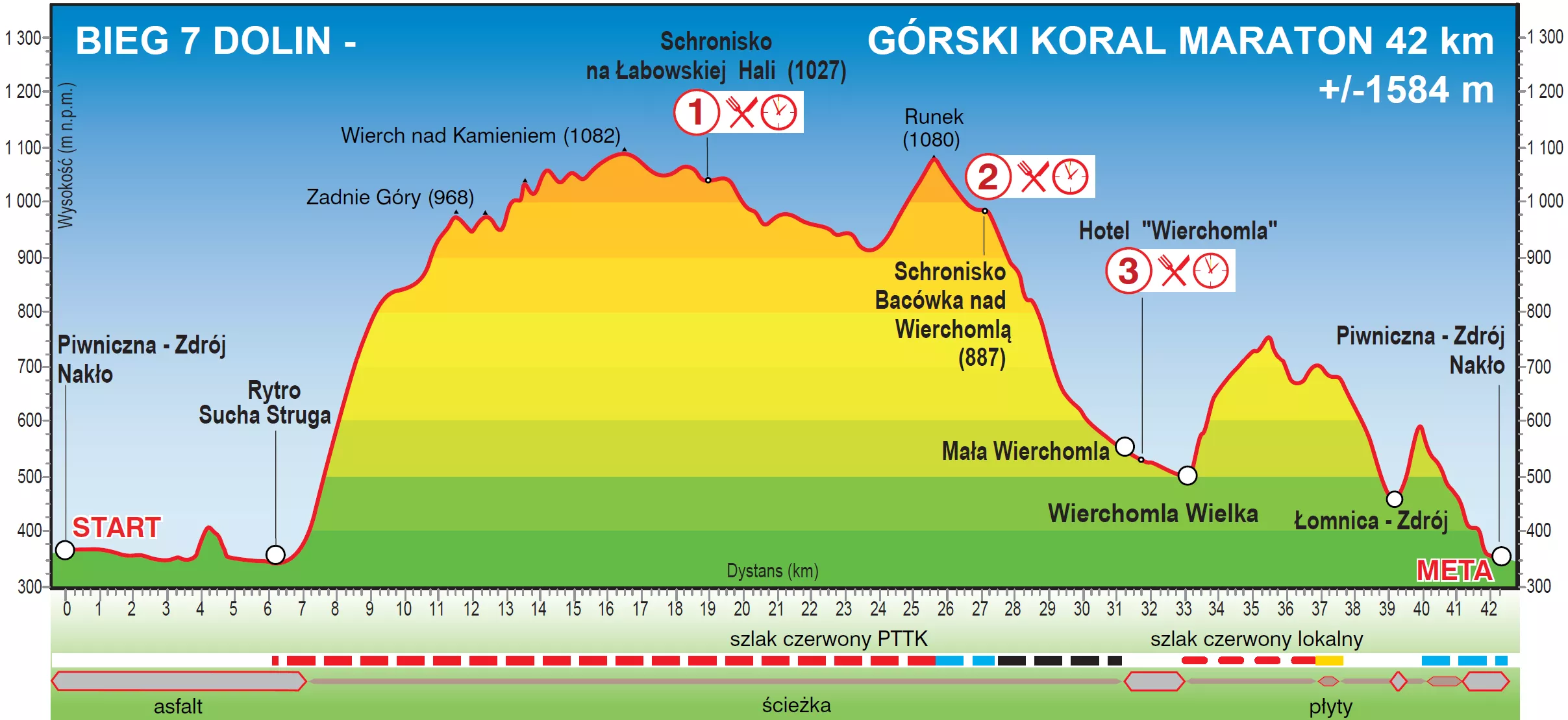 Suma przewyższeń Biegu 7 Dolin Górski Koral Maraton to ponad 1500 metrów. Start i meta w Miasteczku Biegowym na piwniczańskim Nakle. Niebawem więcej informacji!
