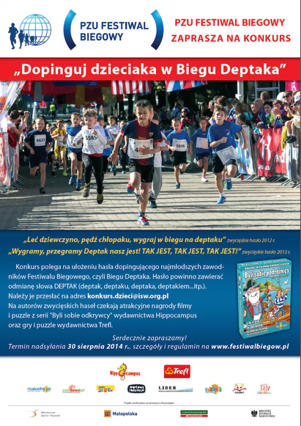 Zabawa polega na ułożeniu hasła dopingującego najmłodszych zawodników PZU Festiwalu Biegowego, czyli Biegu Deptaka. Hasło powinno zawierać odmianę słowa „deptak” (deptak, deptaku, deptaka, deptakiem, deptaki...itp.) - to jedyne nasze wymaganie.