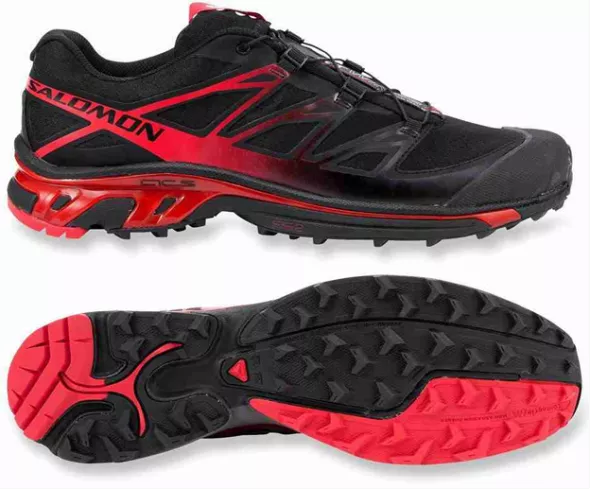 Salomon XT Wings 3 ? but nie ma głębokiego bieżnika, ale poradzi sobie. Może być wykorzystywany dość uniwersalnie. Guma średnio miękka. Nie miałem przyjemności biegać w nich w ciężkim terenie. Ładna kolorystyka, szczególnie czarno-czerwony. Może trochę przemakać, choć system bezszwowy zmniejsza taką możliwość. (zdjęcie http://www.deportesnomadas.com)