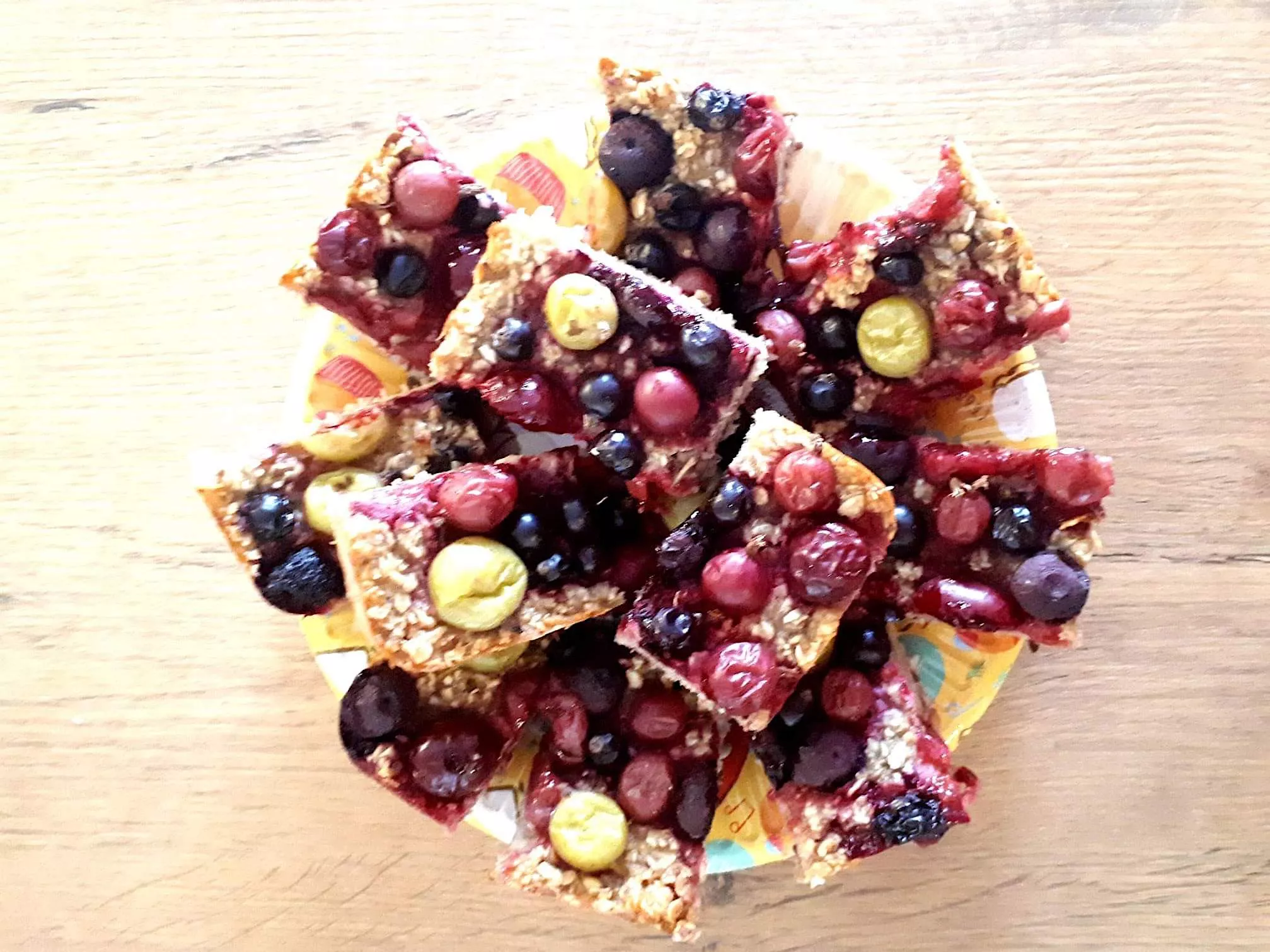 Wszystko mieszamy i zostawiamy na 30 minut. Po tym czasie dekorujemy owocami (mogą być mrożone) i wstawiamy do piekarnika na ok. 40 minut w temperaturze 160 stopni Celsjusza.