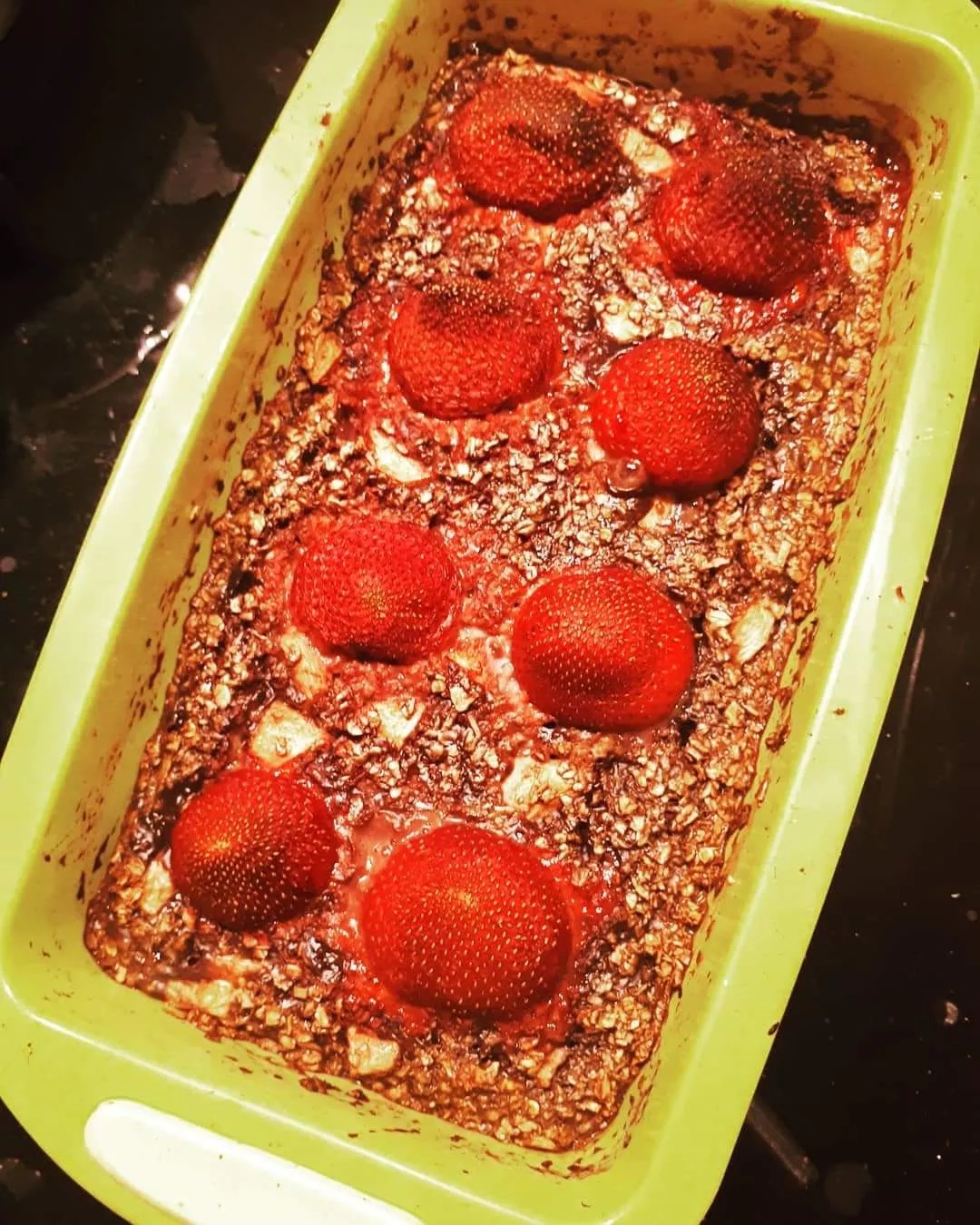 Do prostokątnej formy wsypujemy 2 szklanki płatków owsianych błyskawicznych, szklankę mleka (krowie, sojowe, kokosowe, ryżowe… można też po prostu wodę), dwa jajka (lub coś co sklei masę, np. dojrzały banan, siemię lniane), miód lub inne słodzidło.