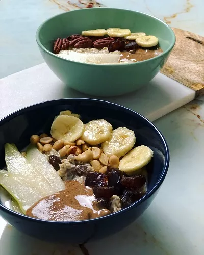 Rano przekładamy dowolną ilość owsianki do miseczki i dekorujemy owocami, orzechami i wybranymi dodatkami. Polecam dojrzałą gruszkę oraz masło orzechowe. Smacznego!