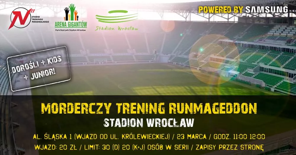 W sobotę 23 marca br. Stadion Wrocław stanie się areną treningu przygotowującego do Runmageddonu. Tego dnia dzieci, młodzież i dorośli będą mogli sprawdzić swoją kondycję przed kwietniowym ekstremalnym biegiem z przeszkodami i odpowiednio się do niego przygotować. Razem z trenerami z N11 Studio będą wzmacniać wytrzymałości i wydolności organizmu, a także szybkość.