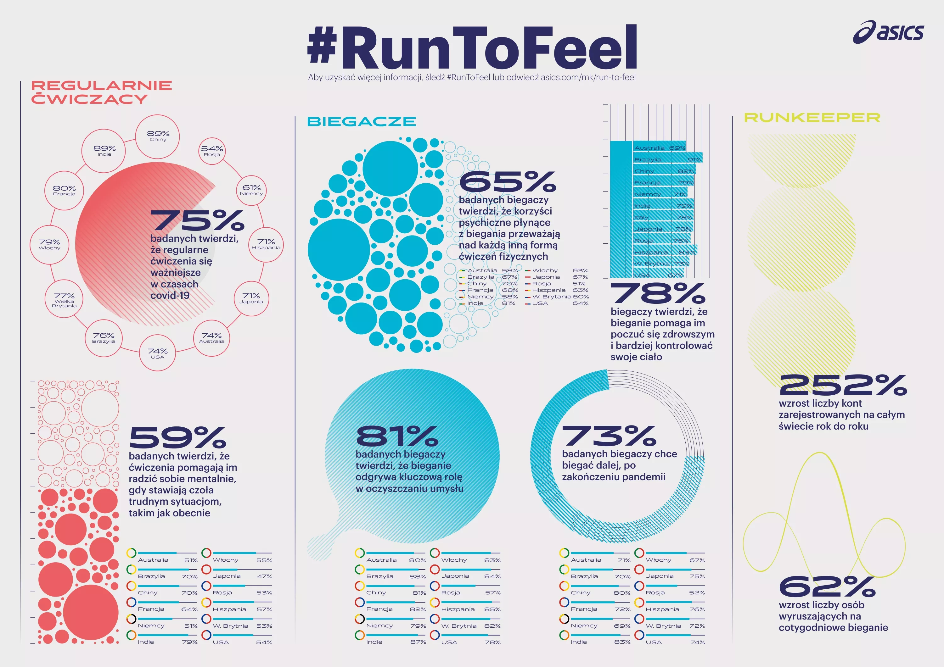Badanie asics ujawniło także inny ciekawy trend, że dla większości osób bieganie to nie tylko sposób na poprawienie kondycji fizycznej, ale również psychicznej. 67% badanych stwierdziło, że regularny trening pomaga im radzić sobie w stresujących sytuacjach, do jakich bez wątpienia zalicza się pandemia. 78% biegaczy uznało, że dzięki aktywności czują się zdrowsi i mają większą kontrolę nad własnym życiem. Niewiele więcej, 81% osób zasygnalizowało, że bieganie pozwala im oczyścić umysł.